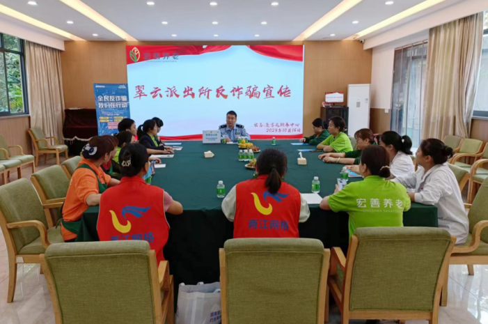 当天下午,福安社区联合翠云派出所到辖区宏善养老服务中心开展反诈反邪宣传。社区民警及社区工作人员通过举办讲座、发放宣传资料等方式,为中心职工讲解常见的诈骗手段、防诈方法,向中心老年人科普邪教组织的危害性和违法性,提醒大家不轻信来历不明的电话、信息,不随意参加不明宗教聚会,如遇可疑情况要及时报警,以免遭到不法分子的侵害。