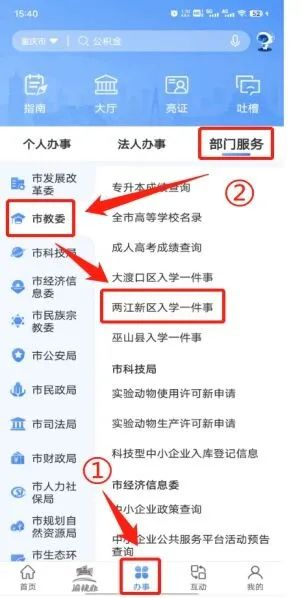 符合入学条件的适龄儿童家长,登录【重庆市政府-渝快办】APP,进入【办事】页面,选择【部门服务】-【市教委】-【两江新区入学一件事】,进入报名系统,完成网上报名信息采集。