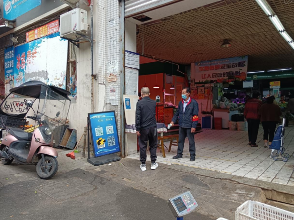在市场入口处,入口工作人员丝毫没有放松,人员进出严格执行扫码查验、体温测量等工作。佩戴口罩的市民有序扫码、测温后进入市场采购。