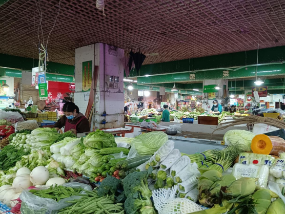 大白菜2.50元/500克、西兰花6元/500克……在两江新区天宫殿街道东湖南路农贸市场,陈列着满满当当的生鲜蔬果。