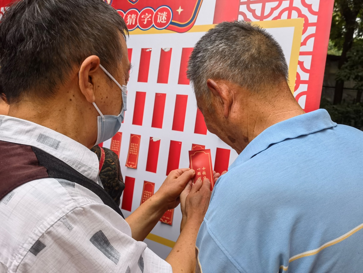 “两眼外秃大嘴巴,有个尾巴比身大,青草假山来相伴,绽放朵朵大红花,猜一动物。” 猜字谜区,居民们有的独自思考,有的在灯谜前酝酿、互相探讨。群众在游戏中感受传统节日文化氛围,欢欢喜喜过中秋。