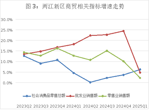 三、2025年1-3月,两江新区社会消费品零售总额完成652.15亿元,同比增长6.2%;批发业销售额2659.50亿元,同比增长4.7%;零售业销售额434.02亿元,同比增长2.2%。其中:直管区社会消费品零售总额完成385.26亿元,同比增长6.4%。
