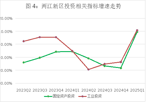 四、2025年1-3月,两江新区固定资产投资同比增长9.3%,工业投资增长8.7%。其中:直管区固定资产投资同比增长10.7%,工业投资增长10.2%。