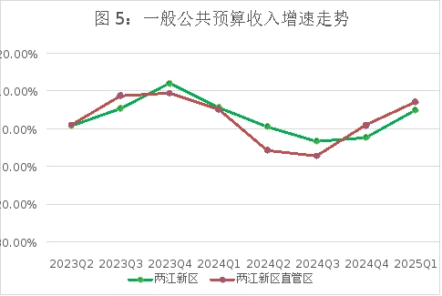 五、2025年1-3月,两江新区一般公共预算收入74.40亿元,同比增长4.8%;一般公共预算支出112.44亿元,同比增长2.3%。其中:直管区一般公共预算收入29.89亿元,同比增长7.0%;一般公共预算支出30.86亿元,同比增长6.0%。