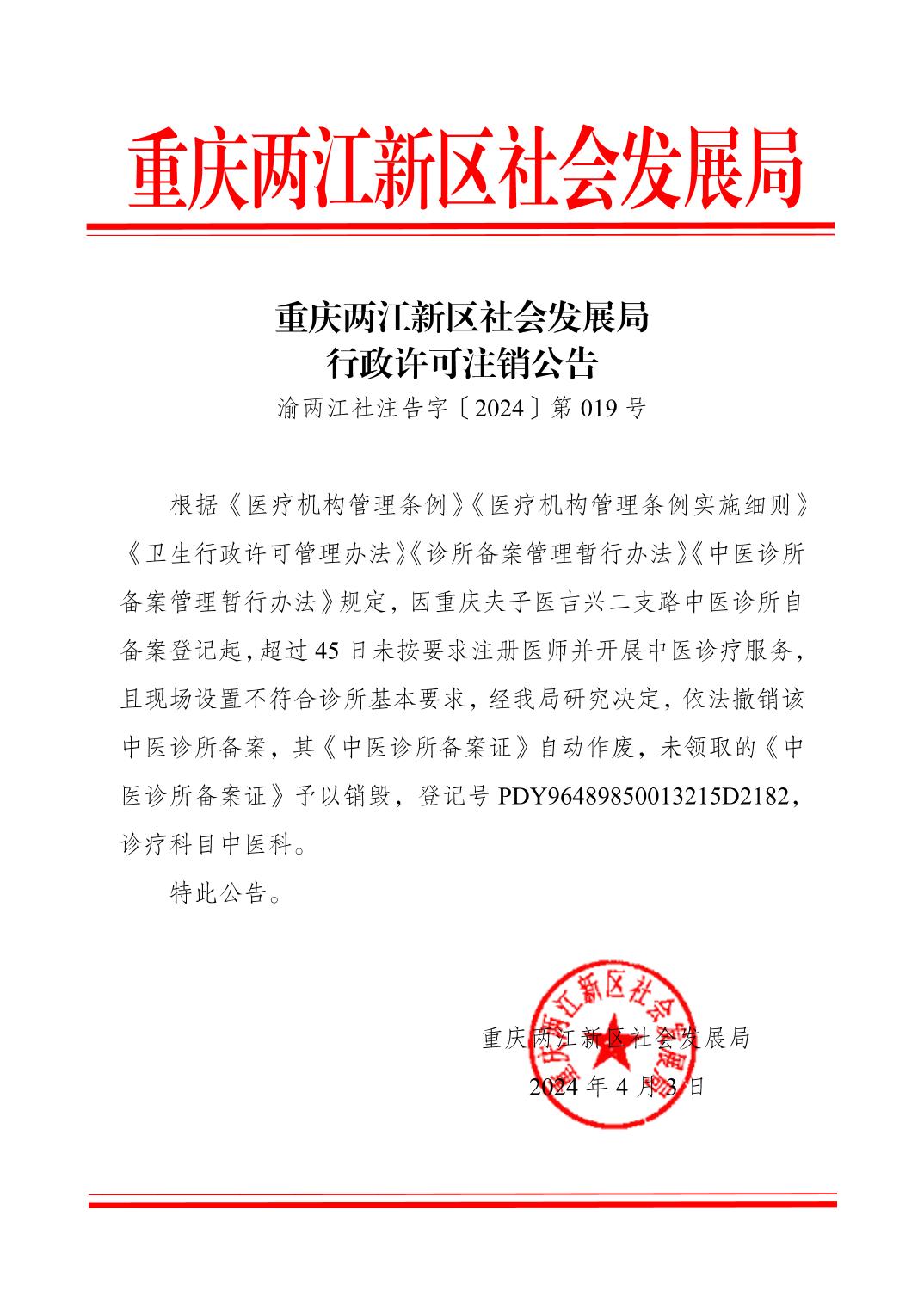重庆两江新区社会发展局行政许可注销公告(重庆夫子医吉兴二支路中医诊所)