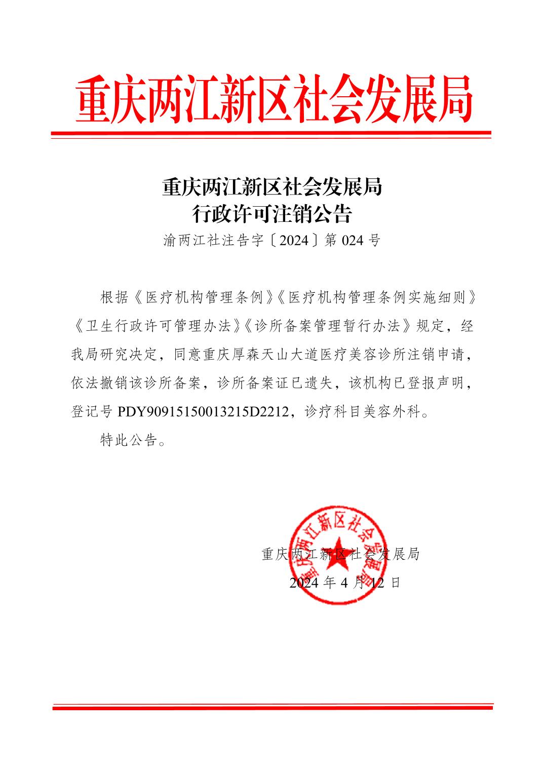 重庆两江新区社会发展局行政许可注销公告(重庆厚森天山大道医疗美容诊所)