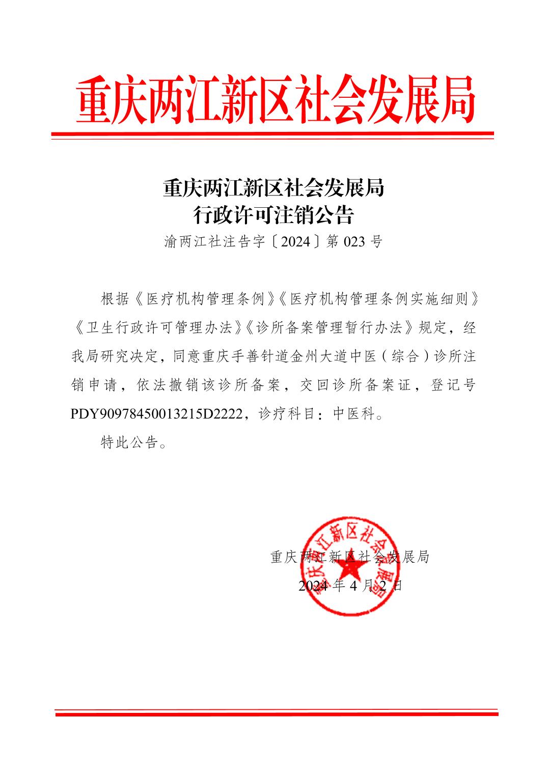 重庆两江新区社会发展局行政许可注销公告(重庆手善针道金州大道中医(综合)诊所)