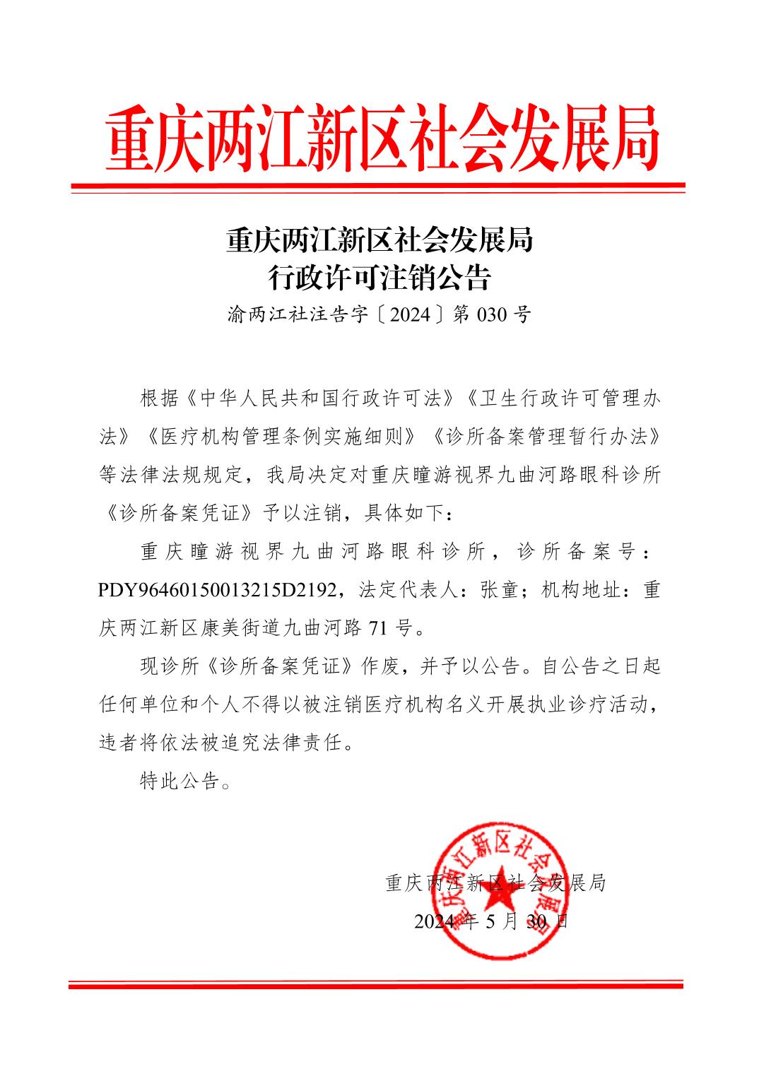 重庆两江新区社会发展局行政许可注销公告(重庆瞳游视界九曲河路眼科诊所)