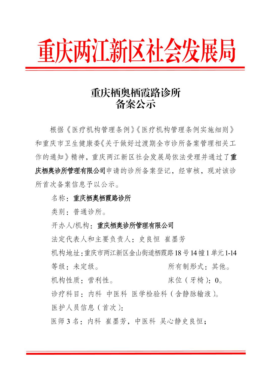 重庆栖奥栖霞路诊所备案公示