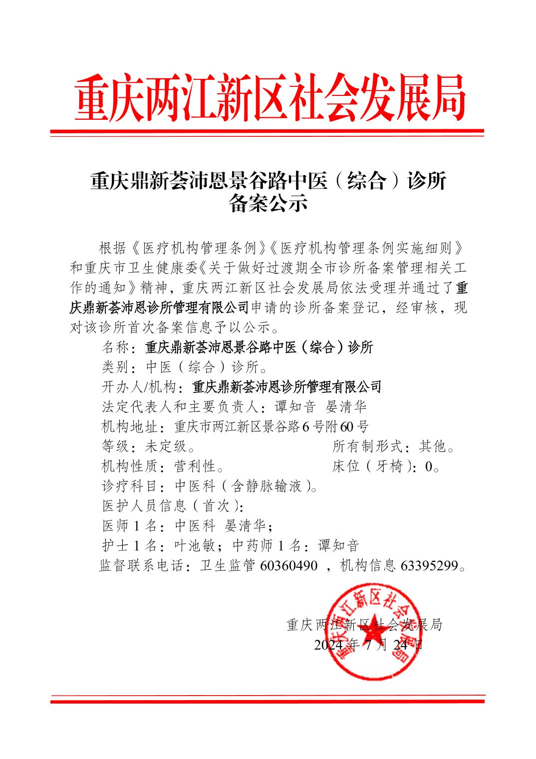 重庆鼎新荟沛恩景谷路中医(综合)诊所备案公示