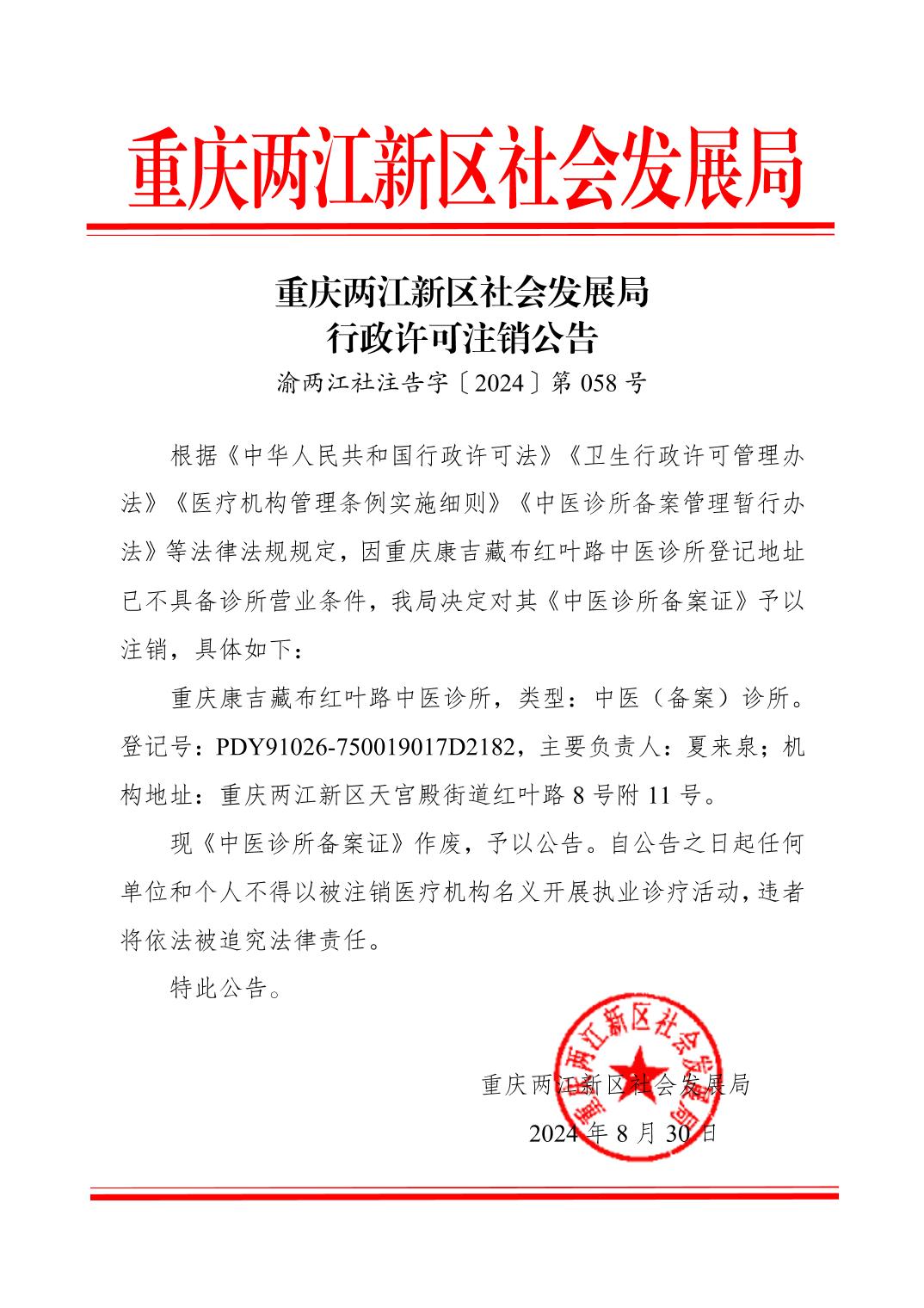 重庆两江新区社会发展局行政许可注销公告(重庆康吉藏布红叶路中医诊所)