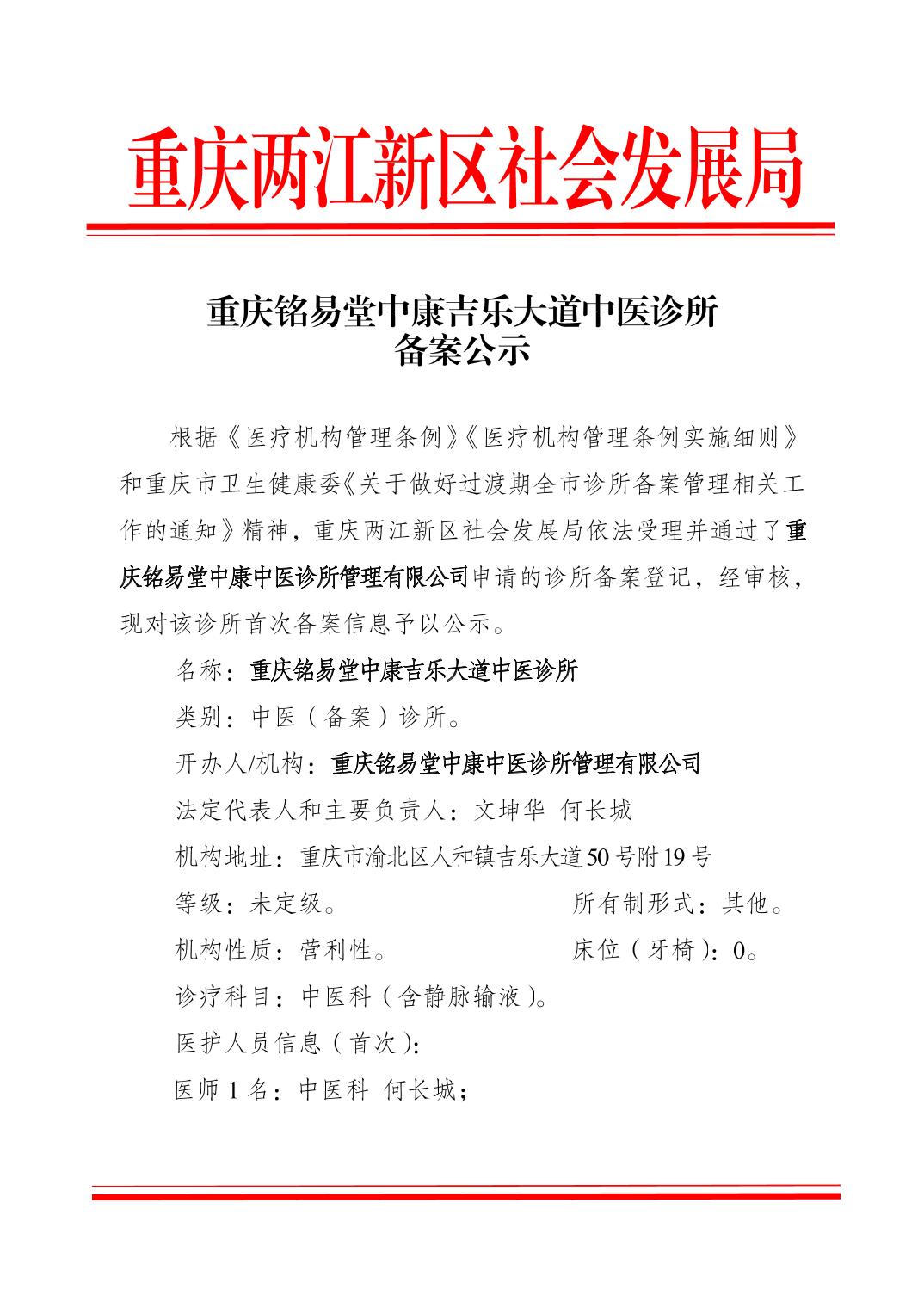 重庆铭易堂中康吉乐大道中医诊所备案公示