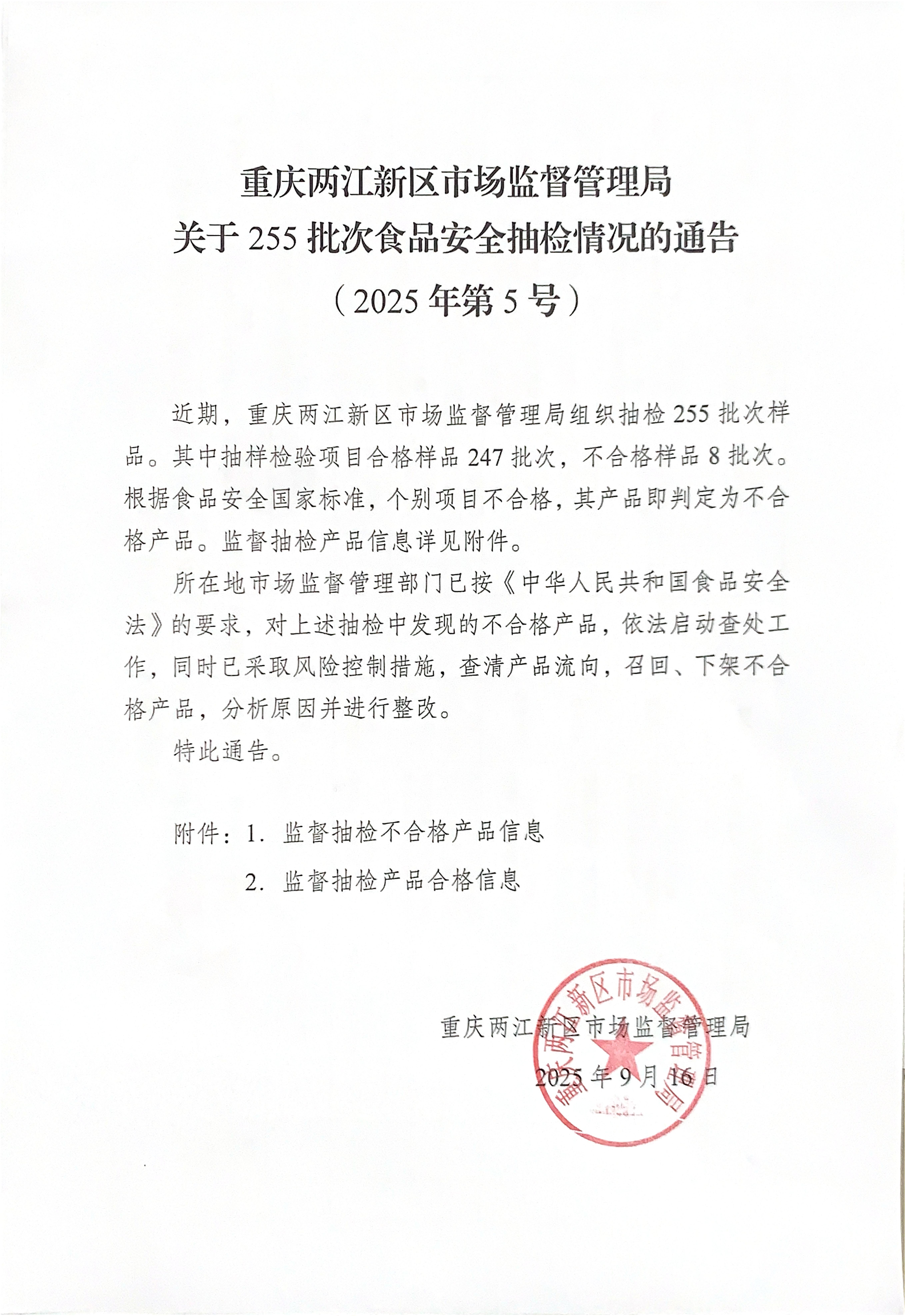 重庆两江新区市场监督管理局关于255批次食品安全抽检情况的通告 (2025年第5号)