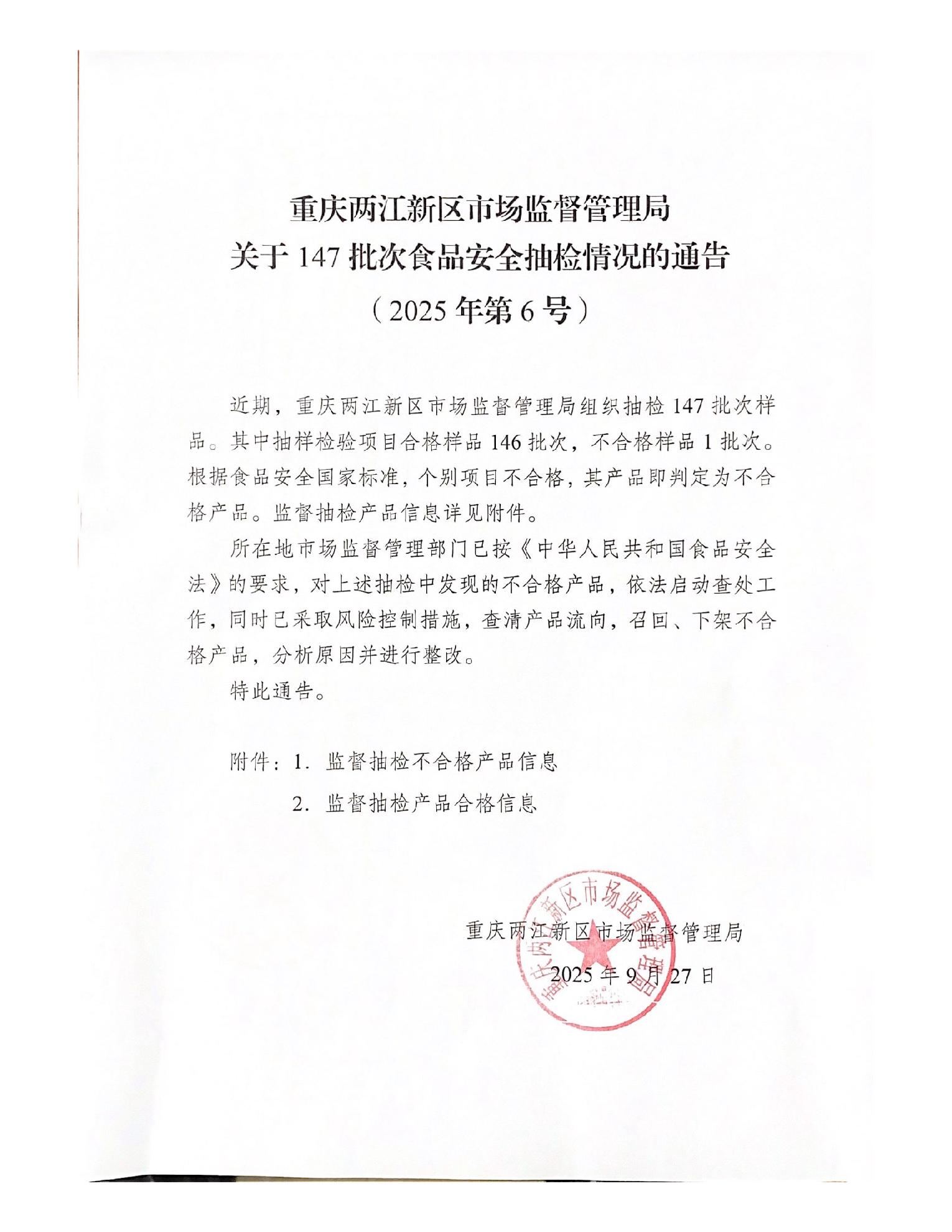 重庆两江新区市场监督管理局关于147批次食品安全抽检情况的通告 (2025年第6号)