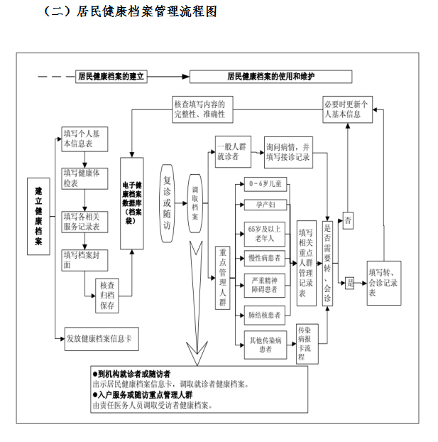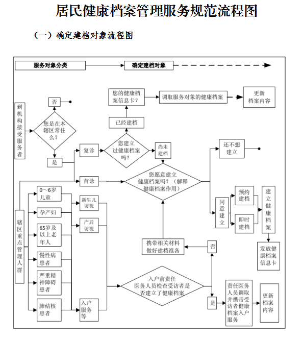 1.辖区居民到乡镇卫生院、村卫生室、社区卫生服务中心(站)接受服务时,由医务人员负责为其建立居民健康档案,并根据其主要健康问题和服务提供情况填写相应记录,同时为服务对象填写并发放居民健康档案信息卡。建立电子健康档案的地区,逐步为服务对象制作发放居民健康卡,替代居民健康档案信息卡,作为电子健康档案进行身份识别和调阅更新的凭证。