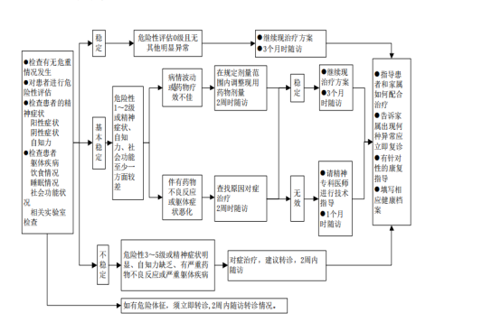 2.病情基本稳定患者。若危险性为1~2级,或精神症状、自知力、社会功能状况至少有一方面较差,首先应判断是病情波动或药物疗效不佳,还是伴有药物不良反应或躯体症状恶化,分别采取在规定剂量范围内调整现用药物剂量和查找原因对症治疗的措施,2周时随访,若处理后病情趋于稳定者,可维持目前治疗方案,3个月时随访;未达到稳定者,应请精神专科医师进行技术指导,1个月时随访。