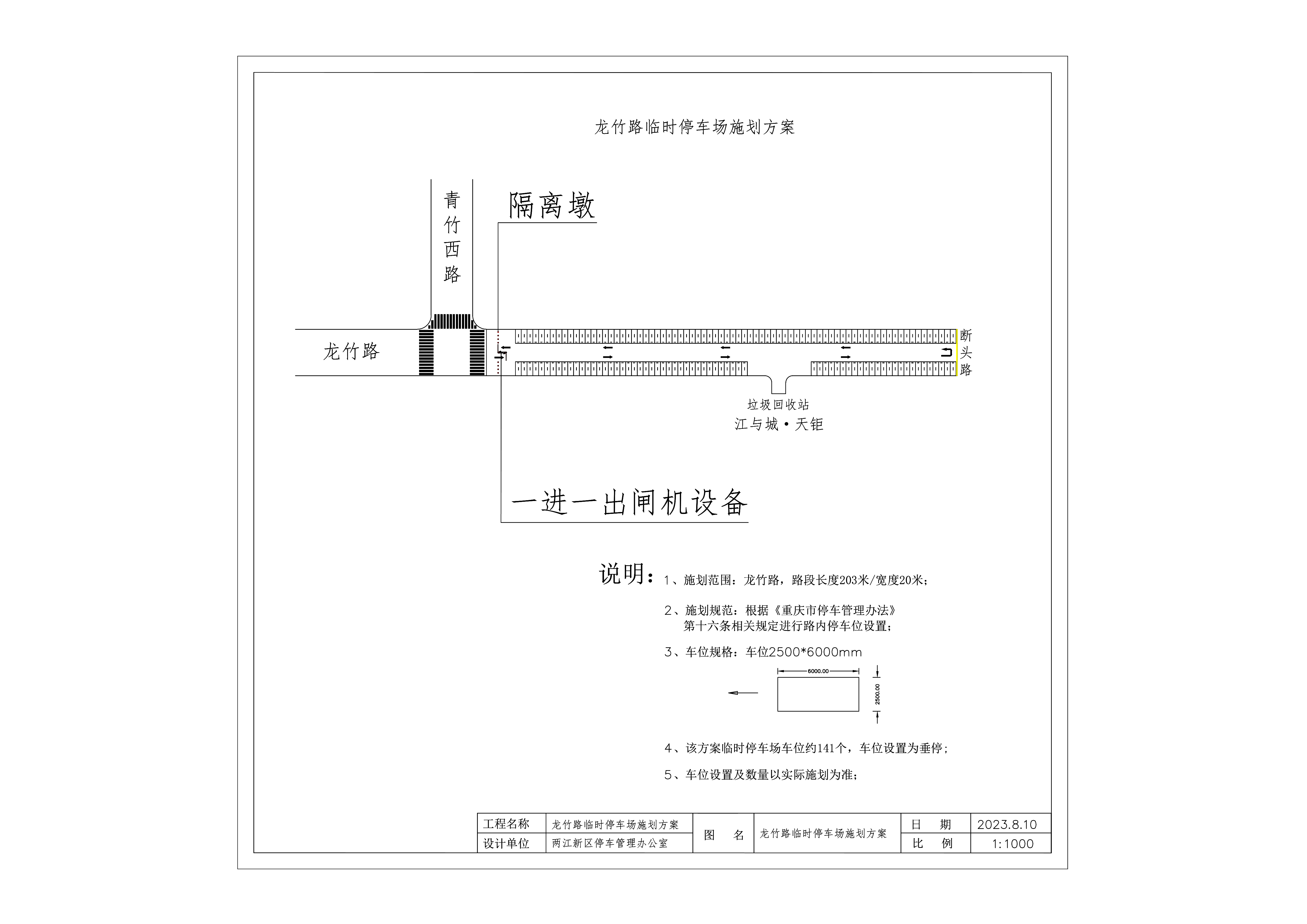为规范龙竹路车辆停放秩序,根据《重庆市市政设施管理条例》、《重庆市停车场管理办法》等相关规定,经大竹林街道、新区公安分局交巡警支队、新区停车办等相关单位研究,拟对龙竹路增设路内停车泊位,实行规范管理。