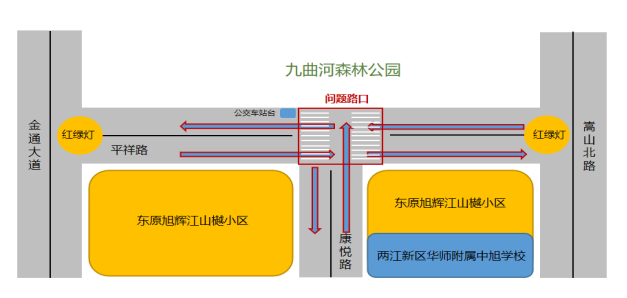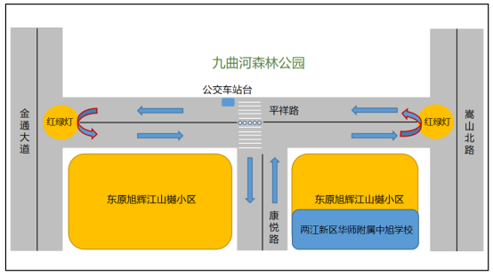 平祥路与康悦路交汇路口位于康美街道,是大竹林通往礼嘉方向的主干道,周边主要辐射东原旭辉江山樾小区、两江新区华东师范大学附属中旭学校及九曲河森林公园,现常住居民4000余户,商户600余户,师生1200余人。该路口交通目前主要存在三方面问题:一是未设置交通信号灯,加之来往车辆多,驾驶速度快,导致车祸频率高,每年平均发生10起以上交通事故,严重威胁行人及驾驶员的人身安全。二是附近小区居民需经由该路口的人行横道过马路到达公交车站乘车或去九曲河森林公园游玩,行人通行频次高,存在交通安全隐患。三是2023年春季开学即将到来,作为通往两江新区华东师范大学附属中旭学校的必经之路,该路口的车流量预估将激增1000辆以上,届时对该路口的交通疏散能力是巨大的挑战,故解决该路口的交通痛点问题,迫在眉睫。