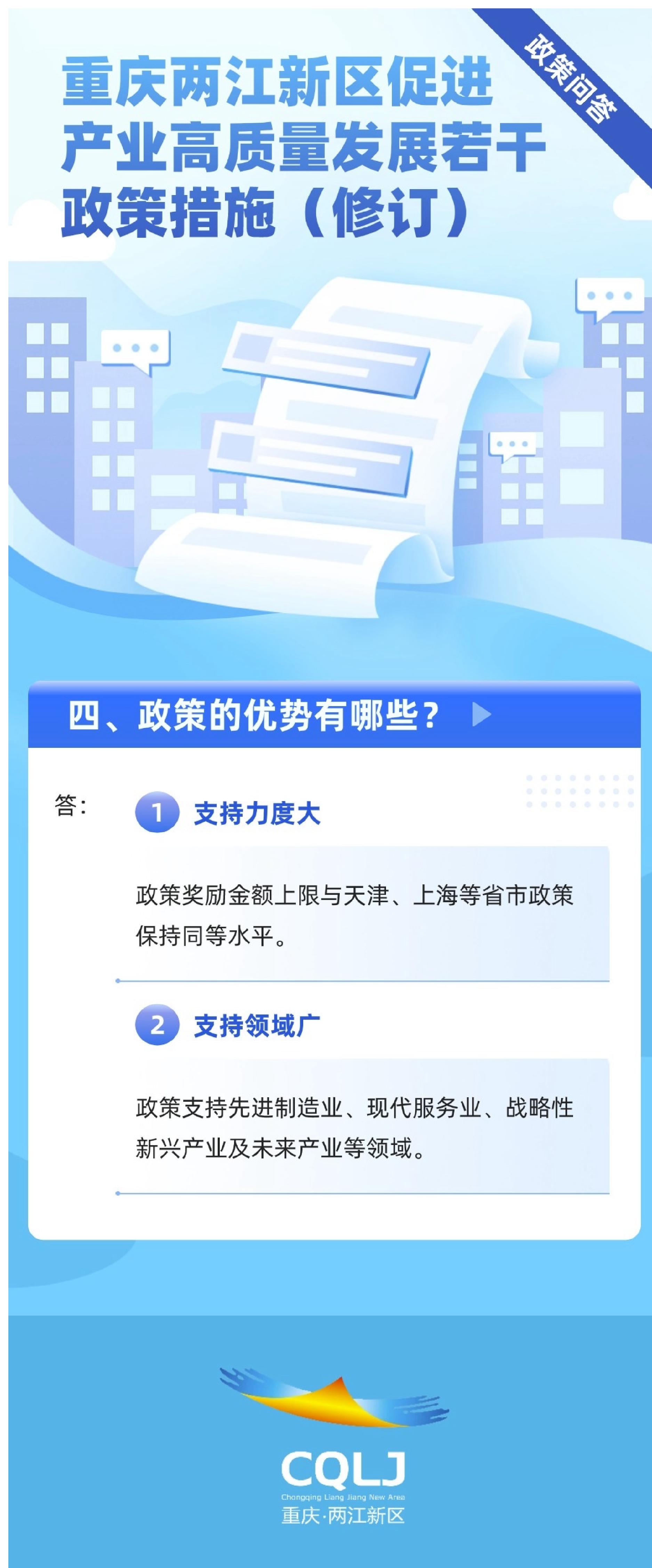 答:一是支持力度大,政策奖励金额上限与天津、上海等省市政策保持同等水平。二是支持领域广,政策支持先进制造业、现代服务业、战略性新兴产业及未来产业等领域。