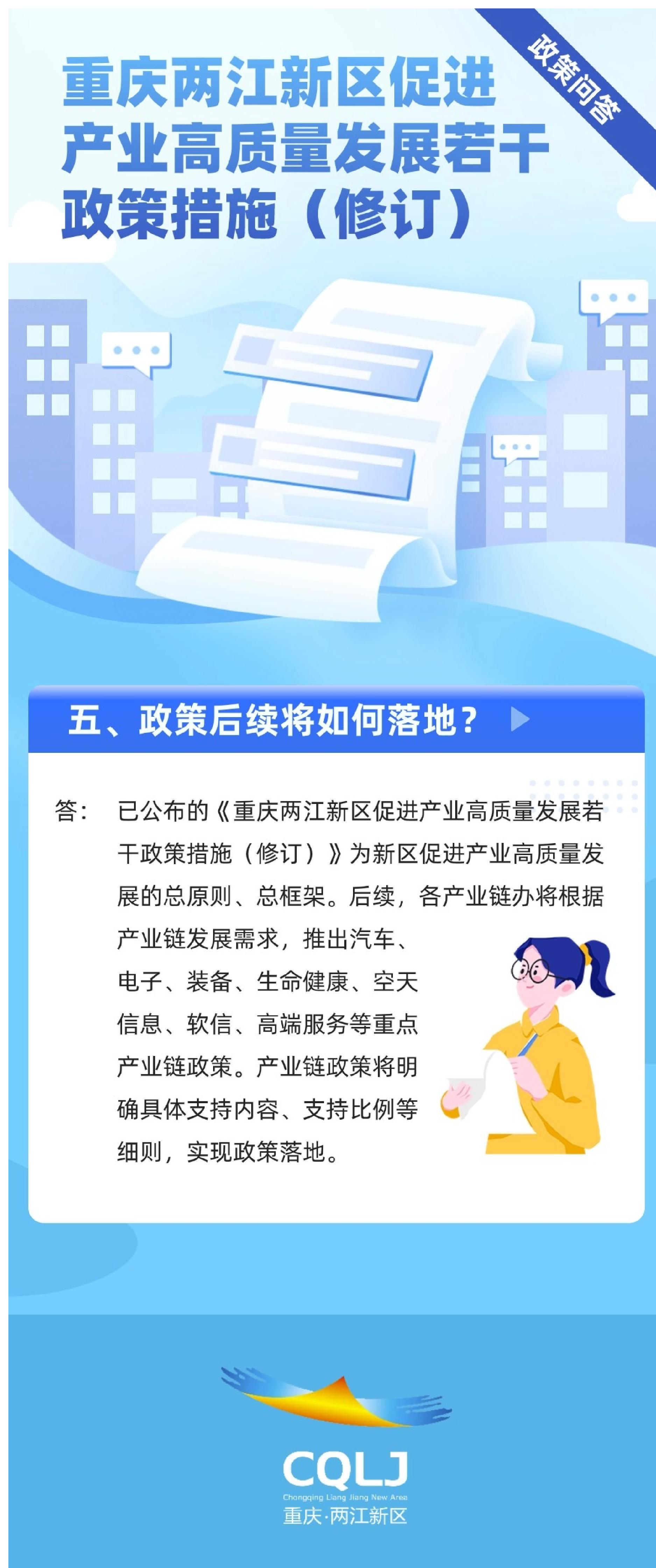 答:已公布的《重庆两江新区促进产业高质量发展若干政策措施(修订)》为新区促进产业高质量发展的总原则、总框架。后续,各产业链办将根据产业链发展需求,推出汽车、电子、装备、生命健康、空天信息、软信、高端服务等重点产业链政策。产业链政策将明确具体支持内容、支持比例等细则,实现政策落地。