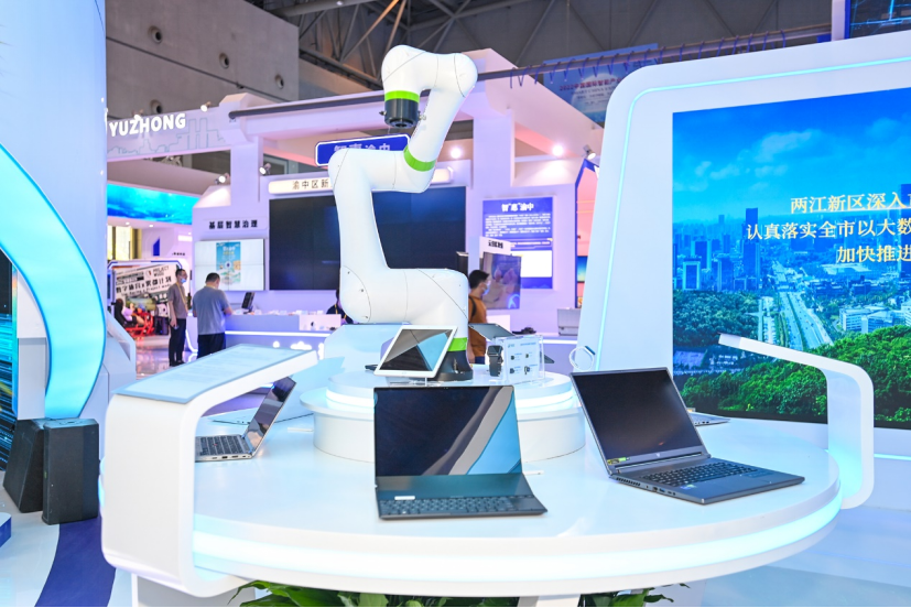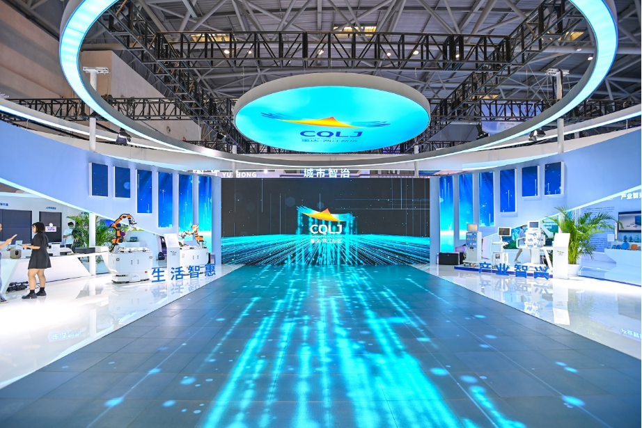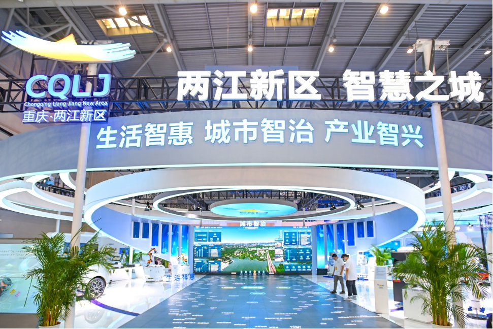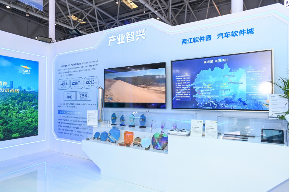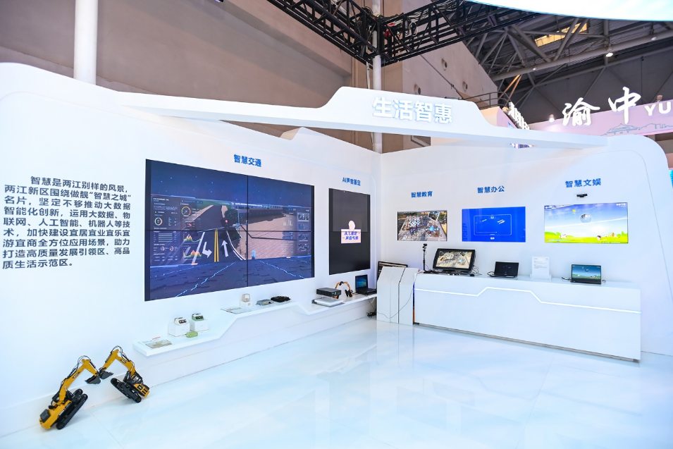 展台设有“生活智惠”“城市智治”“产业智兴”三个展示区,全方位展示两江新区坚持以大数据智能化为引领,推动数字产业化、产业数字化,建设高质量发展引领区、高品质生活示范区成效。