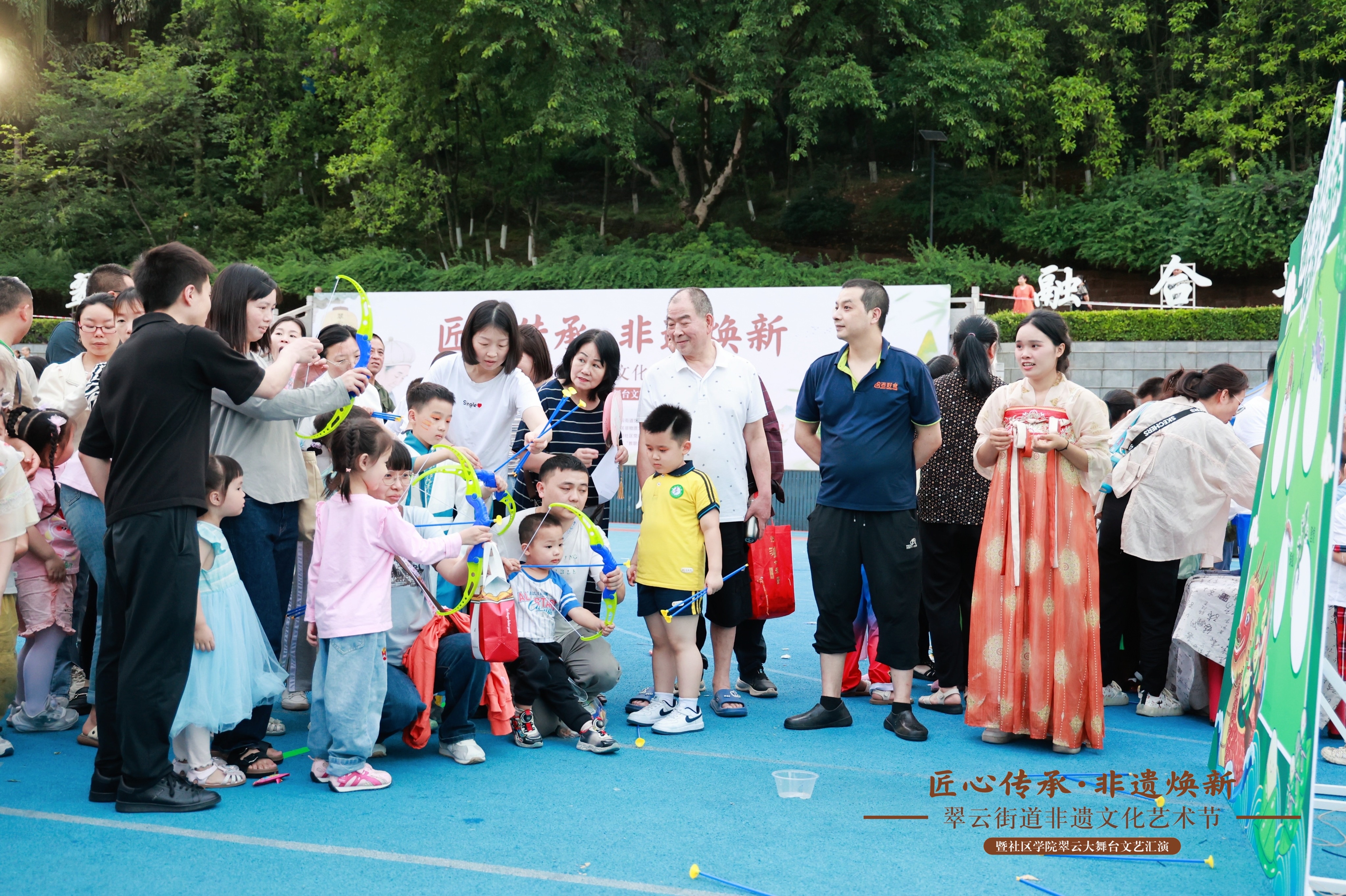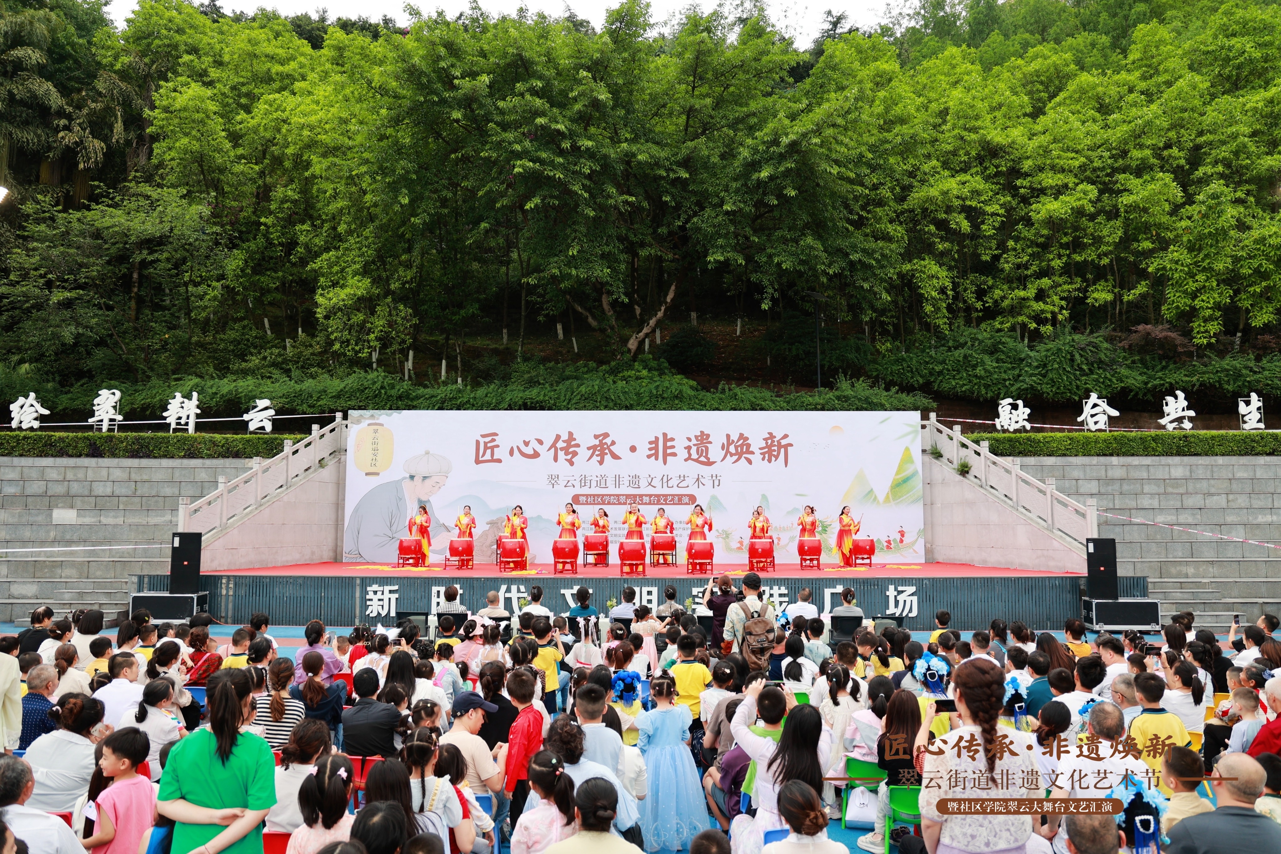 开幕式后,“赏非遗”主题作品展、“戏非遗”游戏互动区、“乐非遗”文化体验区、“品非遗”传统美食市集、“享非遗”中医药文化推广五大活动区同步开放。与此同时,翠云各社区学院文艺队伍轮番登台,带来太极拳、连箫、合唱等精彩表演。