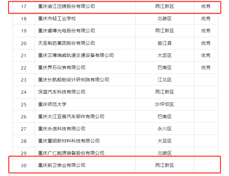 近日,重庆市公布2024年度市级工业设计中心认定名单。其中,大竹林街道重庆渝江压铸股份有限公司和重庆前卫表业有限公司上榜!