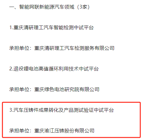 日前,工信部公示首批国家级重点培育中试平台名单,全国共242家入选。其中,重庆12家企业上榜。两江新区大竹林街道企业重庆渝江压铸股份有限公司成功入选。