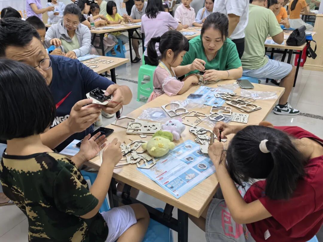 亲子活动方面,孩子们和家长协作完成零部件组装、电路连接,孩子在实践中掌握电学常识、锻炼动手能力,同时加强亲子互动。