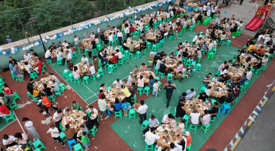 在金童社区,居民们摆出40桌坝坝宴,互相分享美食和邻里趣事。