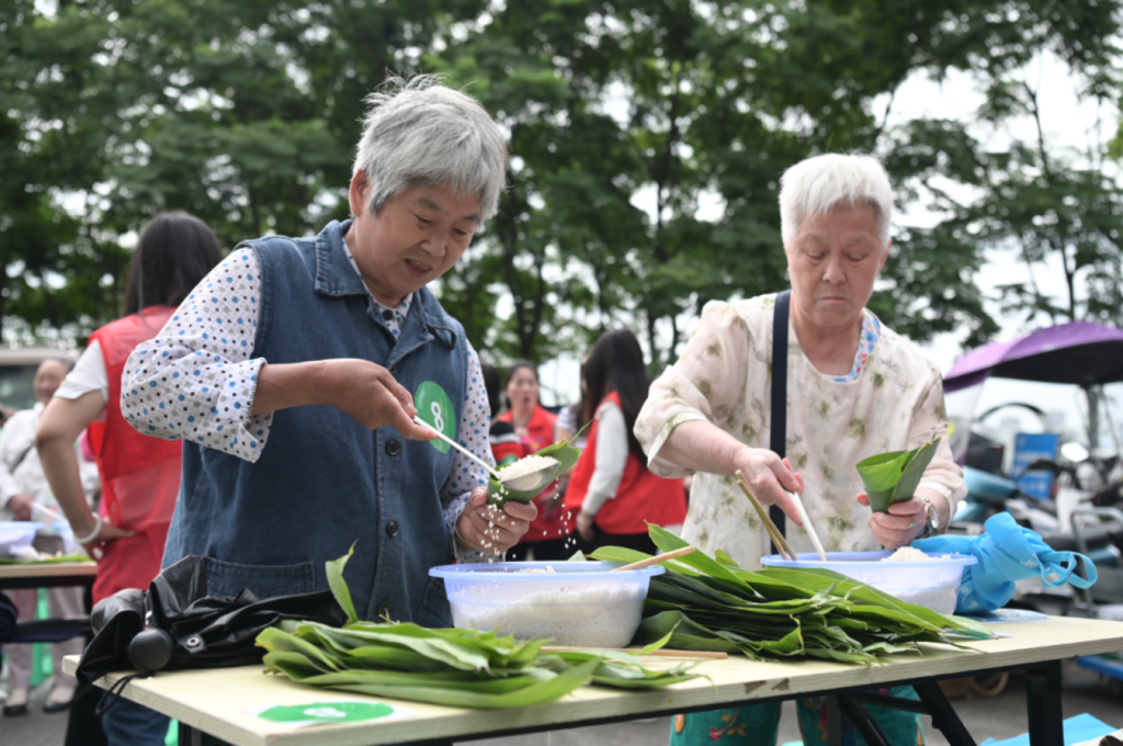 在民心佳园社区,第八届包粽子比赛开展得如火如荼,居民们拼手速拼技术,欢乐过端午。
