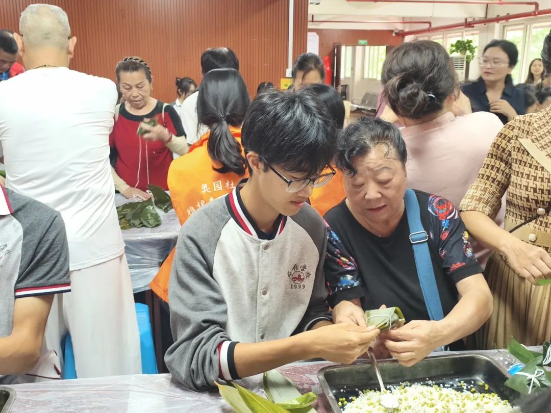在奥园社区,老年人们带着青少年学生包粽子,将传统习俗一代代传递。