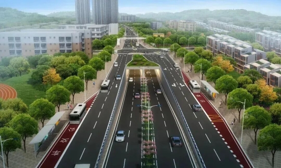 礼白大道拓宽改造工程位于两江新区礼嘉片区,为已有道路拓宽改造项目,项目采用“地面+隧道”方案,现有地面双向4车道宽32米,改造后宽44米,并将新增一条下穿隧道,形成地面双向四车道及隧道双向四车道的城市主干路。