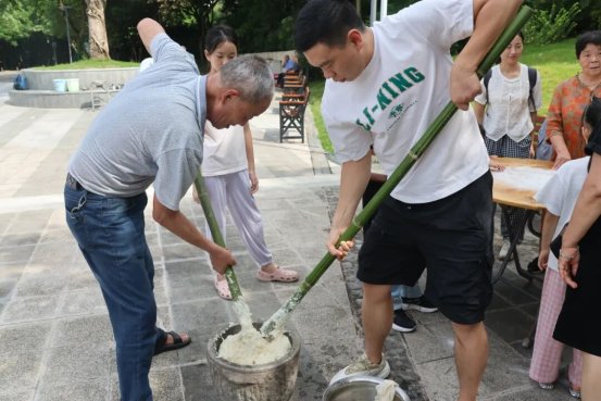 “我为祖国送祝福”区域排起了长队,一张张祝福卡片汇聚成最动人的爱国心声。一旁的中秋传统小吃糍粑制作区更是香气四溢,居民们围在一起,揉糯米、打糍粑、裹黄豆粉,大家分工协作,欢声笑语不断。