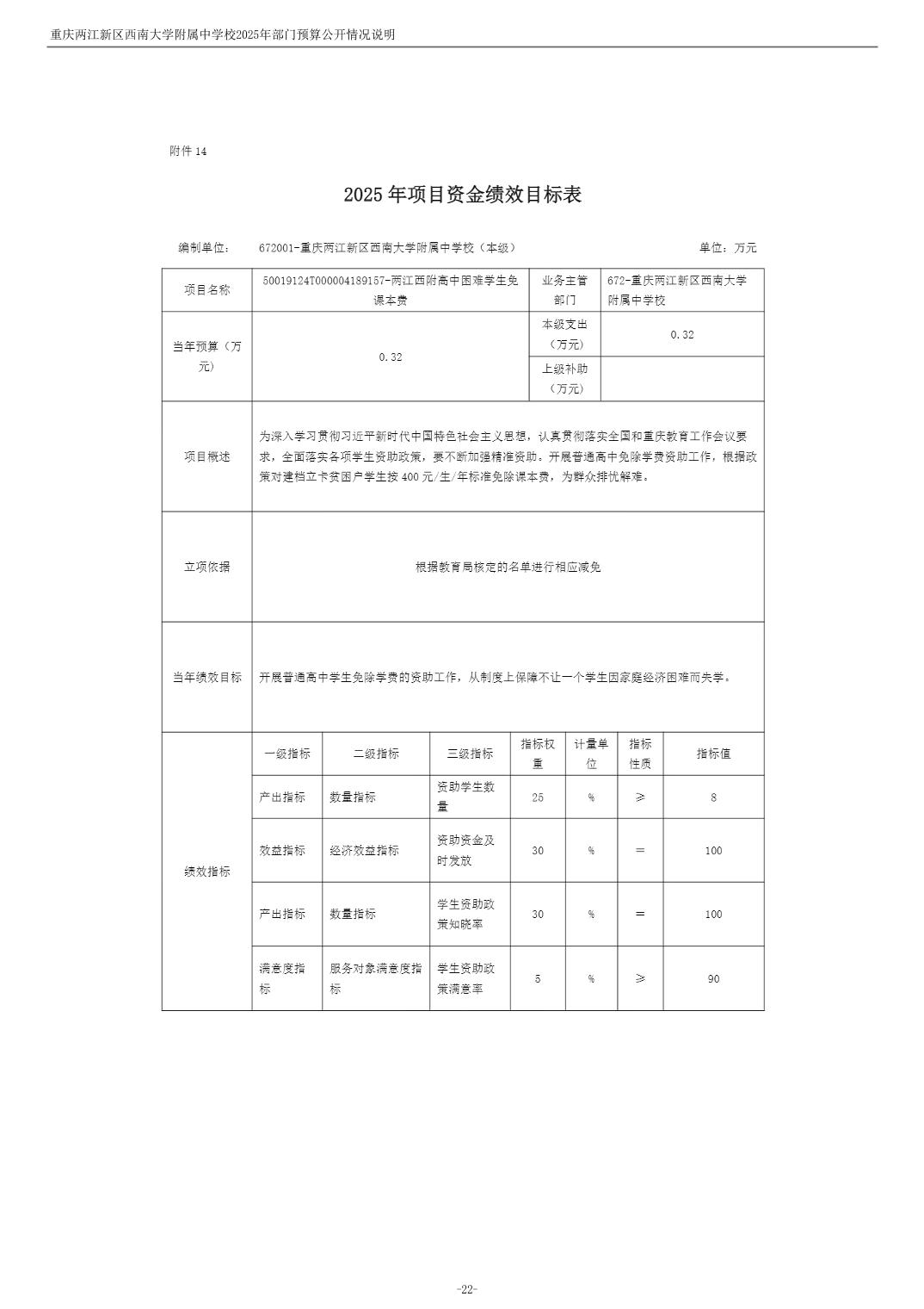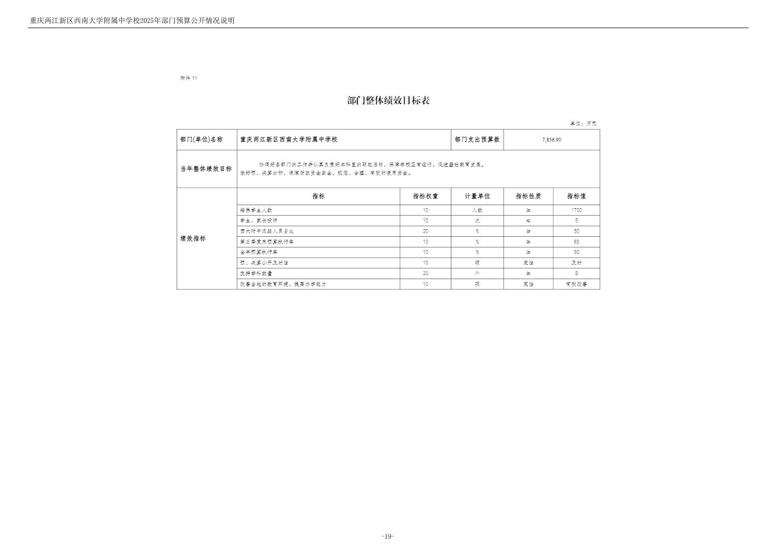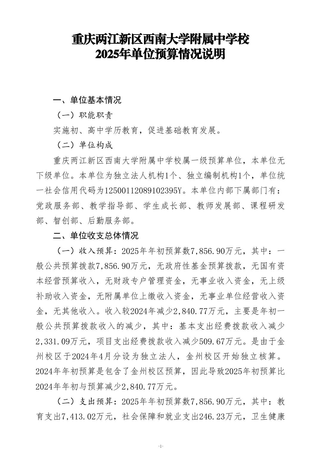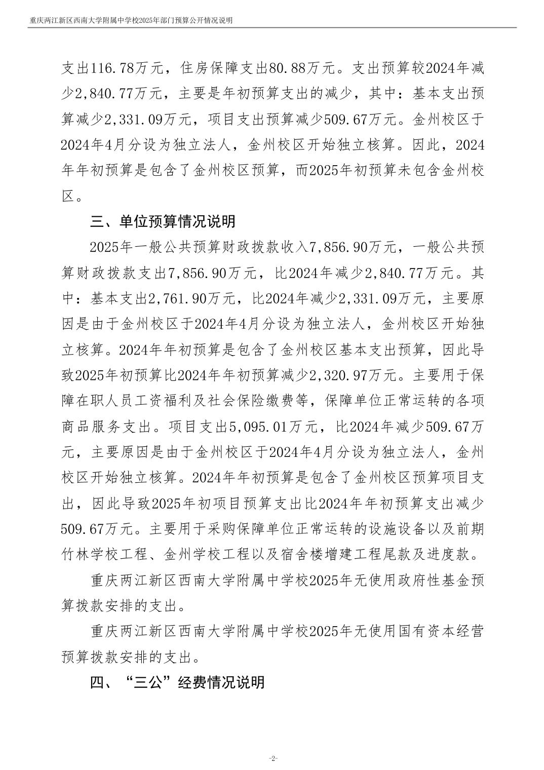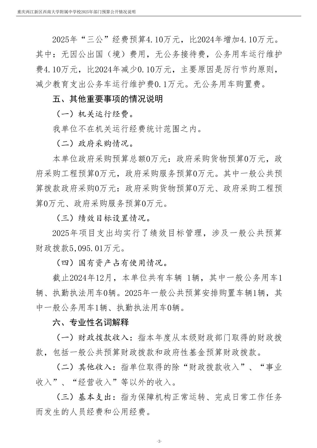 重庆两江新区西南大学附属中学校2025年单位预算情况说明