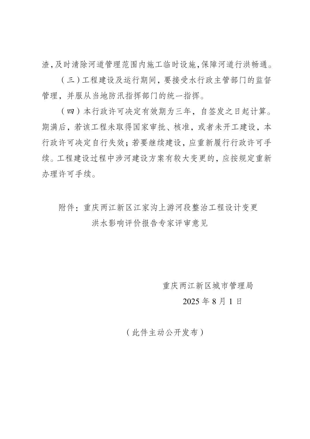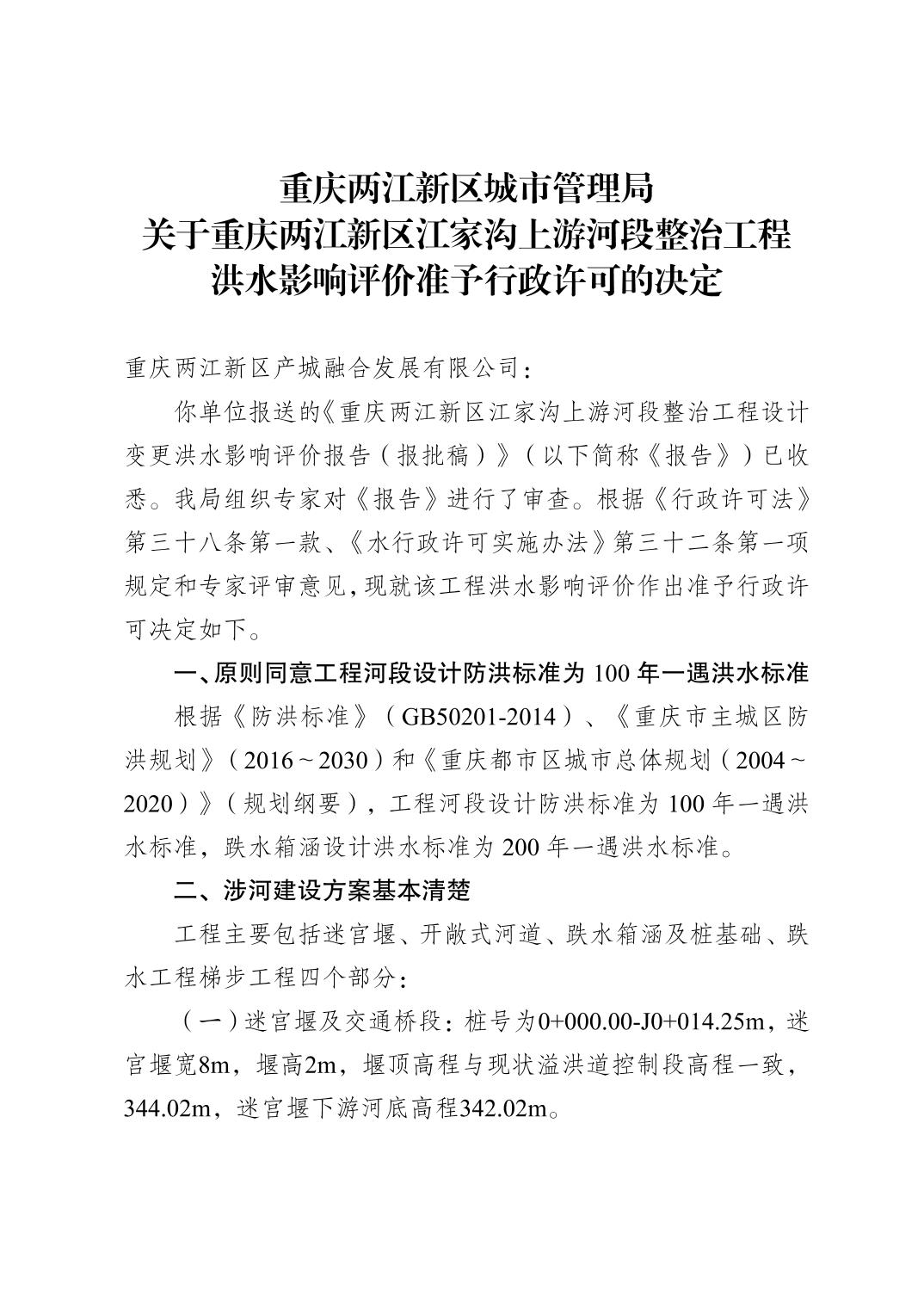 关于重庆两江新区江家沟上游河段整治工程洪水影响评价准予行政许可的决定