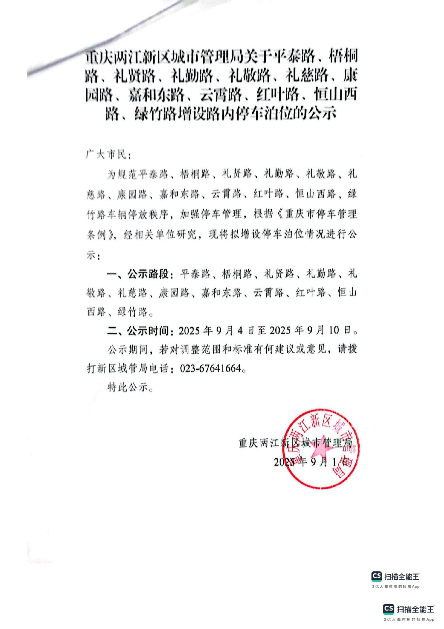 关于平泰路、梧桐路、礼贤路、礼勤路、礼敬路、礼慈路、康园路、嘉和东路、云霄路、红叶路、恒山西路、绿竹路增设路内停车泊位的公示