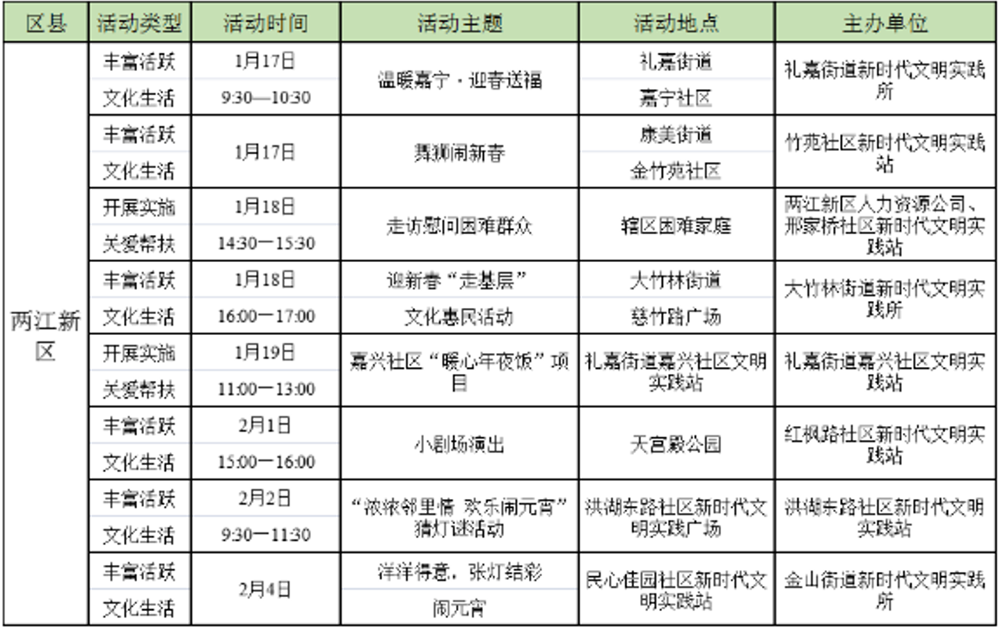 不仅是春节期间,文化消费活动火热。早在春节前,两江新区各街道社区就陆续开展了多种多样的文明实践志愿服务活动。
